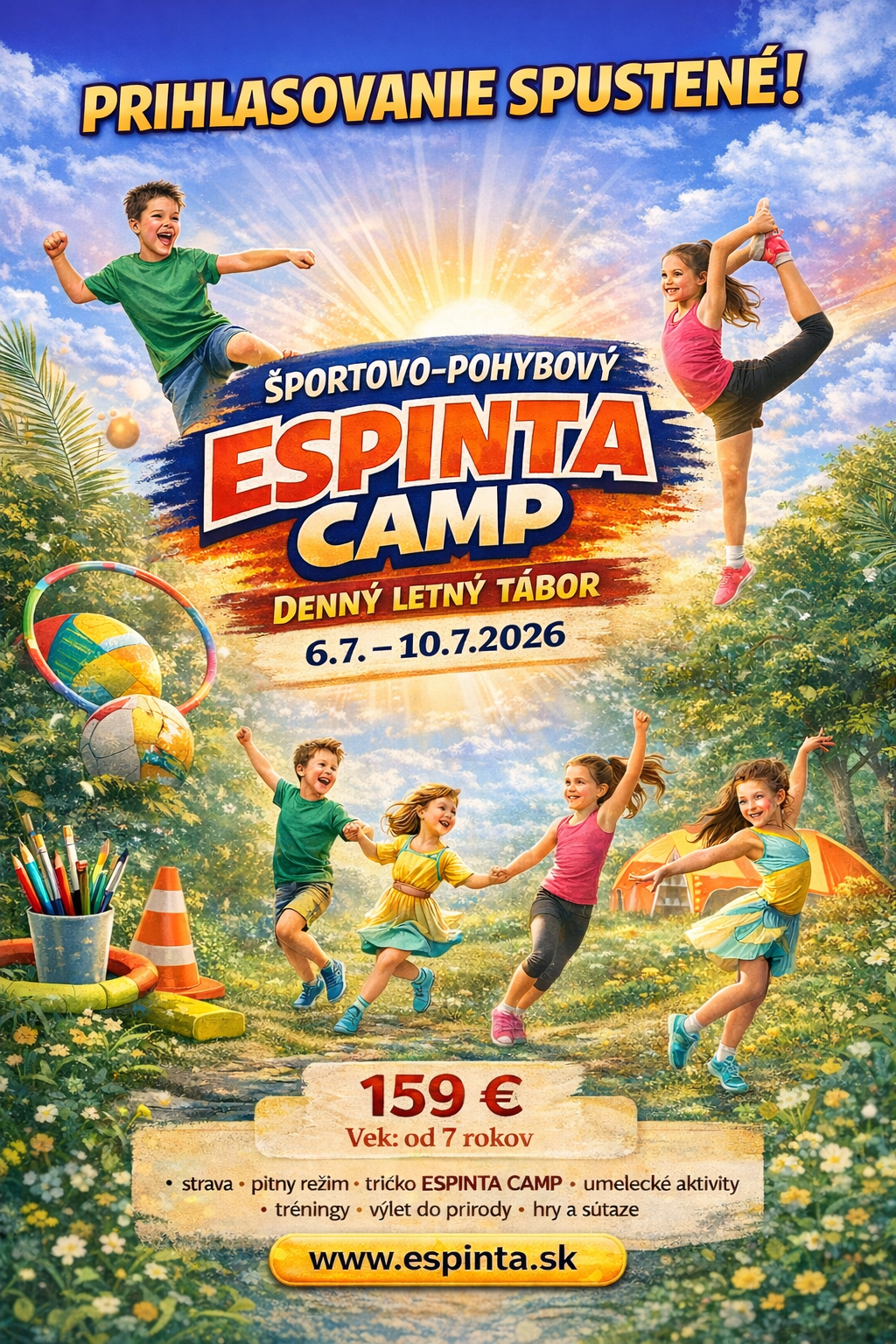 Pripravte sa na nezabudnuteľné leto, ktoré spája tanec, hry, umelecké aktivity a dobrodružstvá v prírode! Tanečné štúdio ESPINTA pozýva všetky deti, ktoré sa radi hýbu, do svojho letného denného tábora, určeného pre deti a mladých ľudí vo veku od 7 do 13 rokov – pre všetkých, ktorí túžia objavovať, tvoriť a baviť sa.